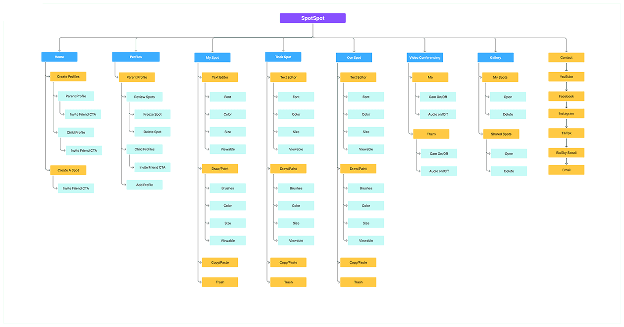SpotSpot's site map balanced the five-spot system with parental controls, creating parallel navigation paths—one for kids' fluid creativity between spots, another for parents' safety oversight and session monitoring without disrupting the creative experience.