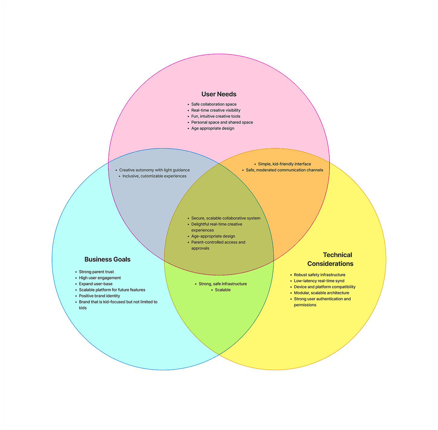 The sweet spots revealed the core solution: secure, scalable collaborative systems that deliver delightful real-time creative experiences with age-appropriate design.