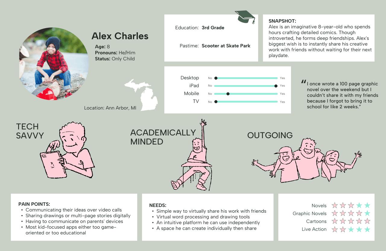 Meet Alex: Our Star Pupil - An imaginative 8-year-old creator who needs a digital space to collaborate on stories and artwork with friends who live across town because spontaneous creative collaboration shouldn't be limited by physical distance.
