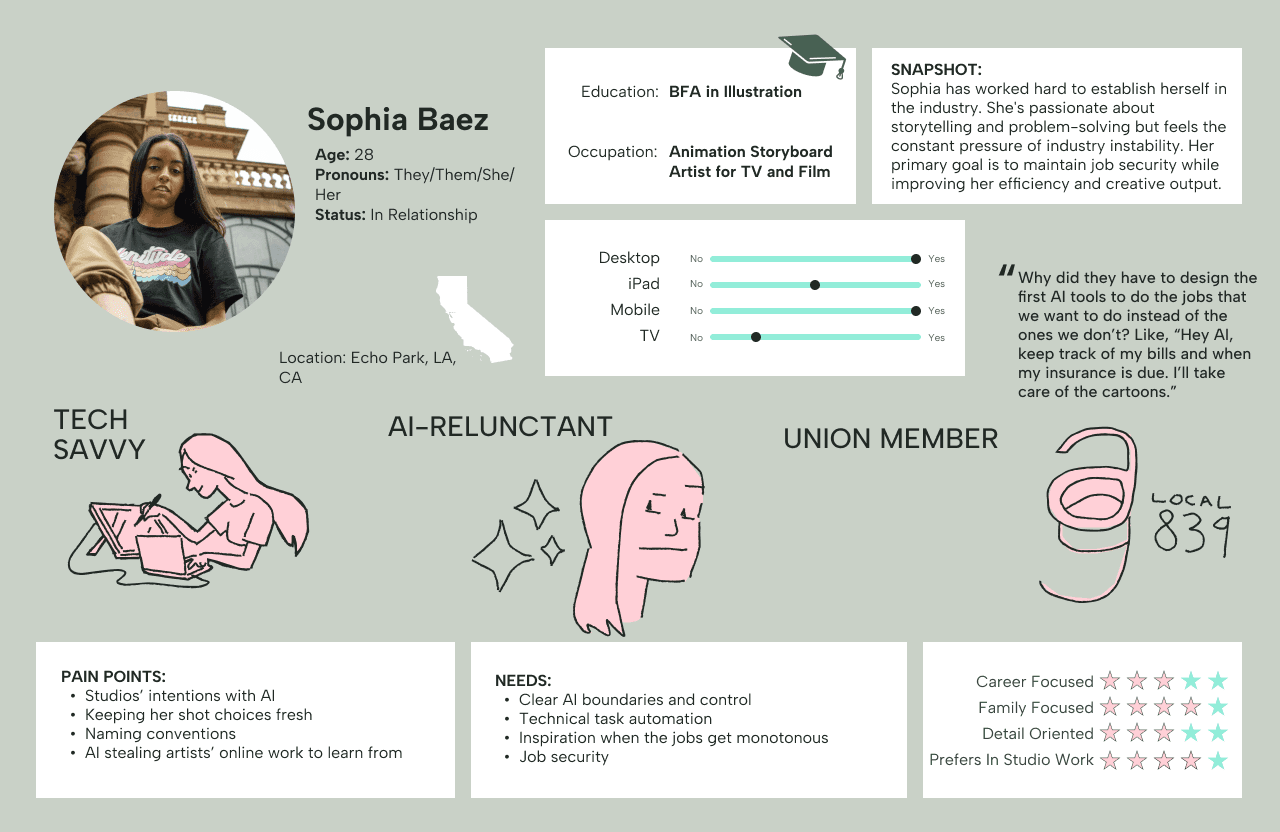 Meet Sophia: Our Target User - A passionate storyboard artist who's worked hard to establish themselves in the industry. Sophia feels constant pressure from industry instability and wants to maintain job security while improving efficiency and creative output.